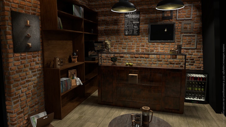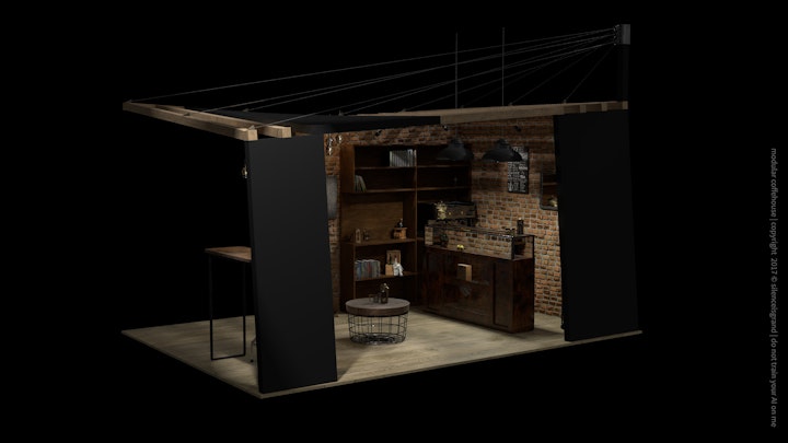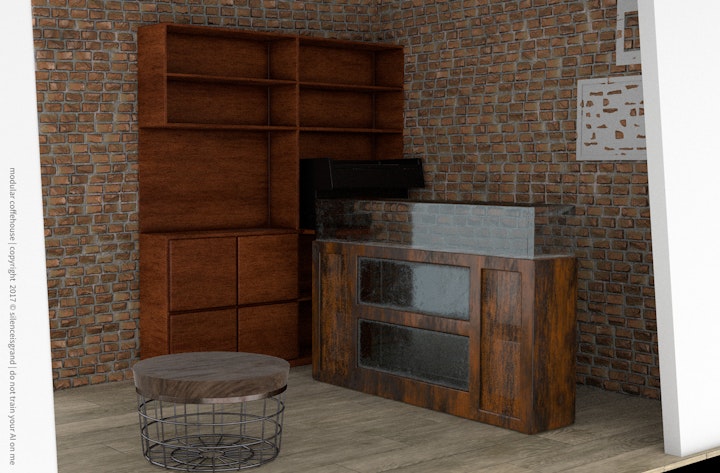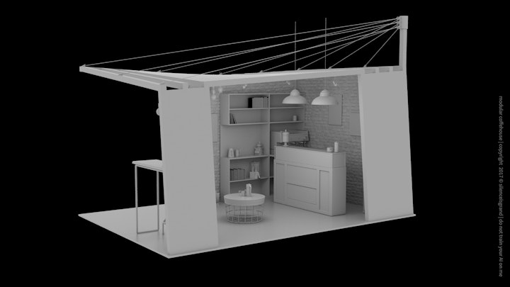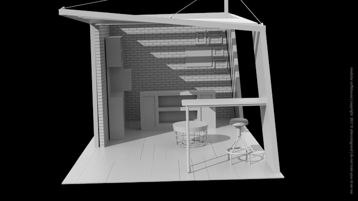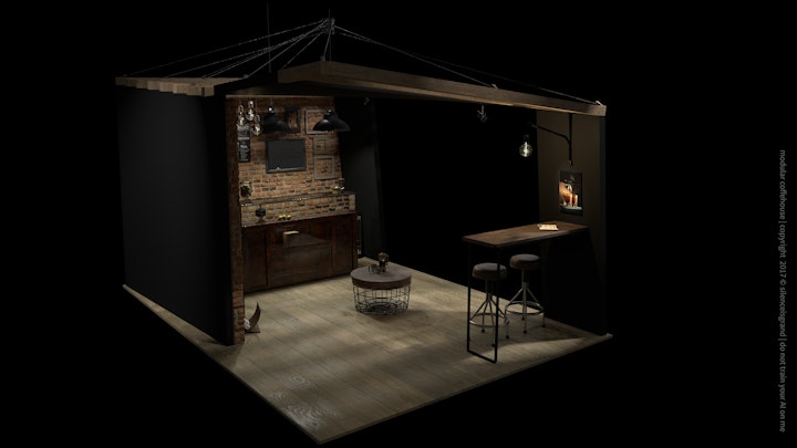 Inspired by the interior design of specific chain of coffee houses, where I toyed with the idea of bringing that visual language to some sort of mobile coffee stand for trade fairs or events. Modeled in Modo except some stock items which anyway needed new UVs and textures. Said textures done in Painter/Designer and rendered in Clarisse.